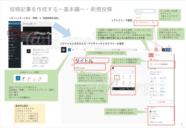 WordPressを納品する際に、「ブログ記事の更新」の基本的な操作マニュアルとして、制作者がお客様へお渡しできるように作りました。